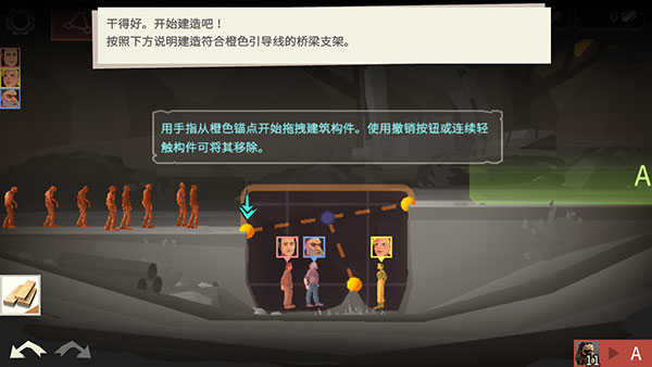 4.按照游戏中橙色的引导线,从锚点开始拖拽建材,搭建桥梁的主体支撑结构。