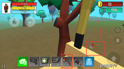 1、进入游戏后熟悉操作逻辑,对准地图物资点击手掌图标拾取,开局用斧头挥砍树木收集木材等基础资源。