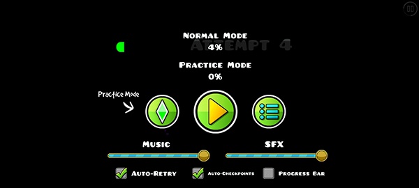 4、新手推荐先从前几关节奏较慢、障碍清晰的关卡熟悉跳跃手感,了解各种地形机制(如三角刺、翻转地面、传送门等)。