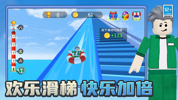 1、以水上滑梯为主题的模拟体验类游戏,玩家可以在多种不同的滑梯上尽情体验极速下滑;