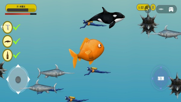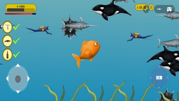 2. 你需要时刻保持警惕,灵活躲避那些体型比你庞大、会主动攻击你的各类天敌与海洋危险生物。
