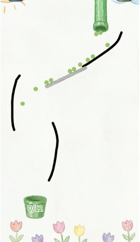 1、在关卡中,你需要通过在屏幕上画线,构建斜坡或轨道,引导彩色小球掉入对应的花盆。