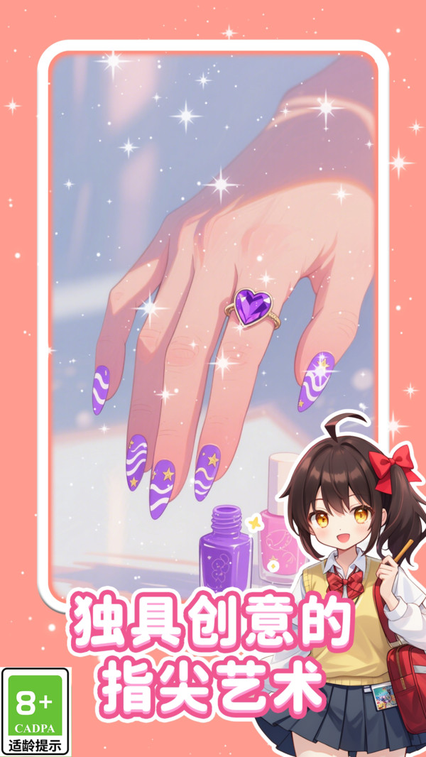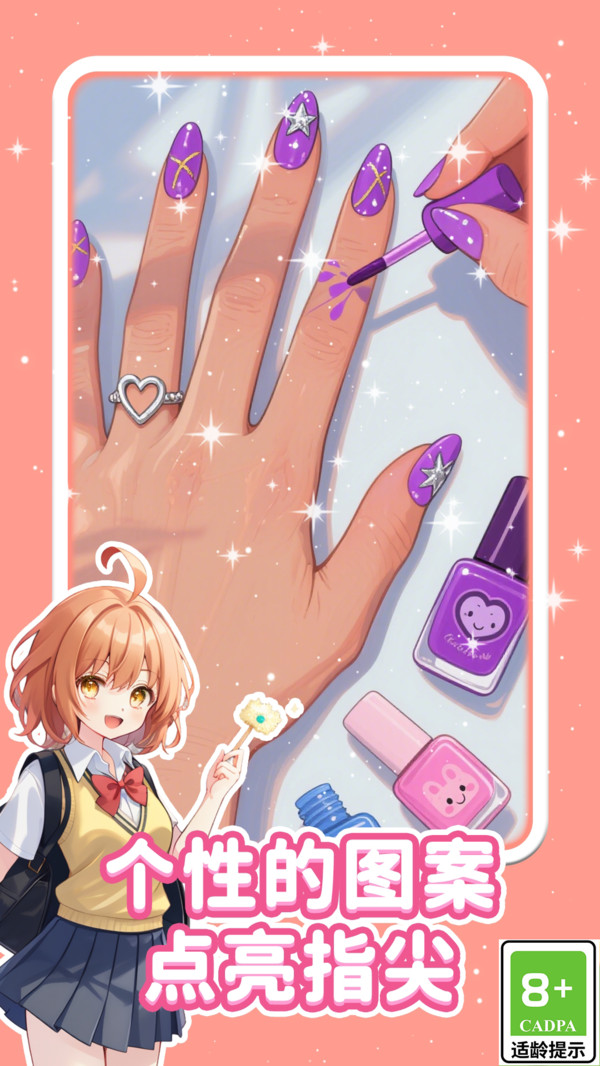 3、游戏画面精致唯美,色彩搭配和谐舒适,营造出浪漫梦幻的氛围,让你沉浸在美甲的奇妙世界中。