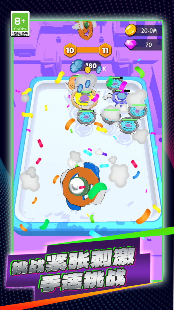 陀螺斗技场是一款融合策略布局与操作技巧的多人在线对战游戏!在这个热血沸腾的竞技舞台上,你将化身为顶尖陀螺高手,精心组建并不断强化你的专属陀螺阵容,在流光溢彩的竞技场中与各路玩家展开激烈碰撞,尽情体验瞬息万变的精彩战斗乐趣!游戏凭借其精致细腻的画面呈现、行云流水的操作手感以及层次丰富的策略体系,为广大竞技游戏爱好者构建了一个充满激情与挑战的陀螺对战世界!