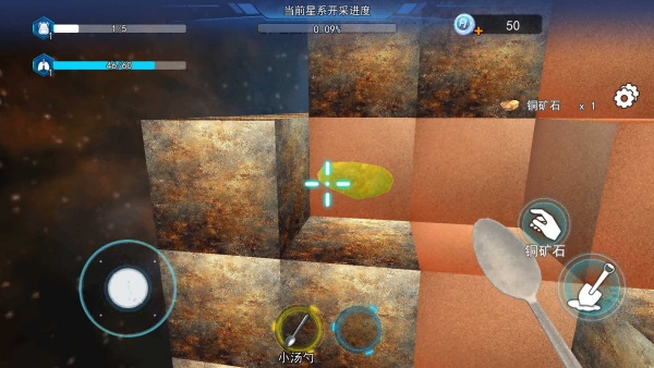 2、降落后,使用初始的塑料勺或后续解锁的铲子、冲击钻、炸药等工具,对矿脉进行挖掘,收集散落的矿石。