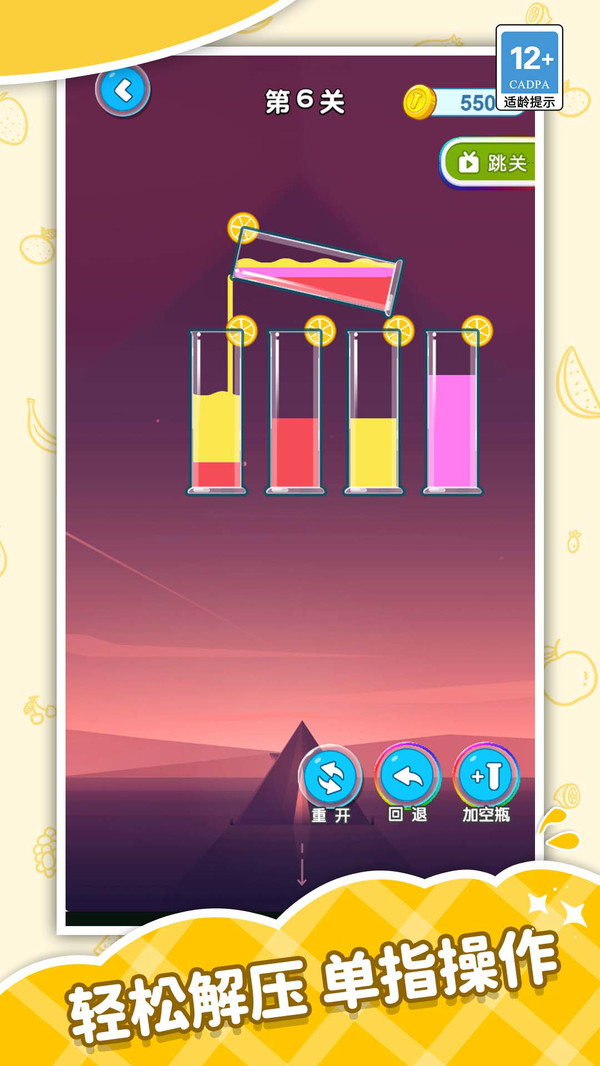 2、倒水的规则很简单,可以将果汁倒入空瓶中,或者倒入最上方有着相同颜色果汁的瓶子中。