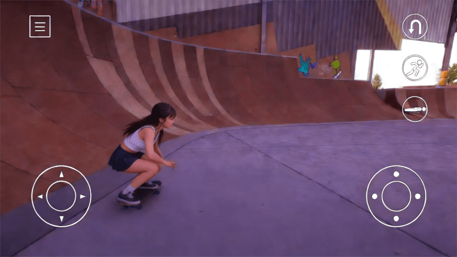 1、扮演一位热爱街头文化的滑板少女,在城市广场、街区与公园中自由驰骋,体验接近真实的滑板操作手感。