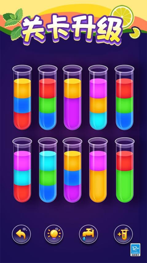 1.随着关卡推进,试管数量和颜色种类会增加,玩起来就像在完成一个个优雅的色彩拼图。