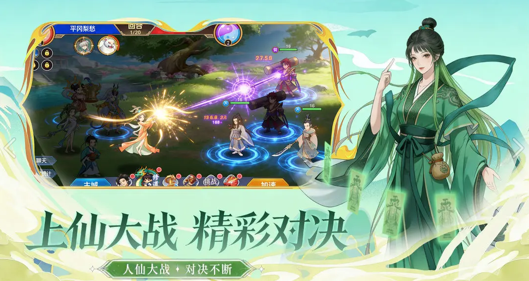 九世仙缘采用独特的策略卡牌玩法,每一步决策都充满智慧挑战。游戏核心为五行剑阵体系,将五行相生相克理念巧妙融入战斗。不同剑魄卡牌拥有专属属性与技能,玩家需结合对手特点和场上局势灵活调整阵型,通过布阵、蓄势、连携等战术取胜。每场战斗既是实力的比拼,更是道心与谋算的较量。
