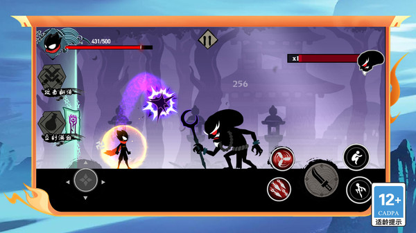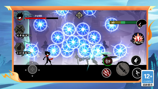 1、屏幕左侧轮盘控制火柴人移动,右侧控制跳跃以及攻击技能释放。