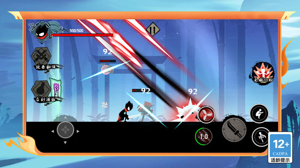 1、采用经典的火柴人美术风格,角色动作流畅有力,技能特效醒目而不花哨,在极简的线条勾勒中突出打击感与速度感。