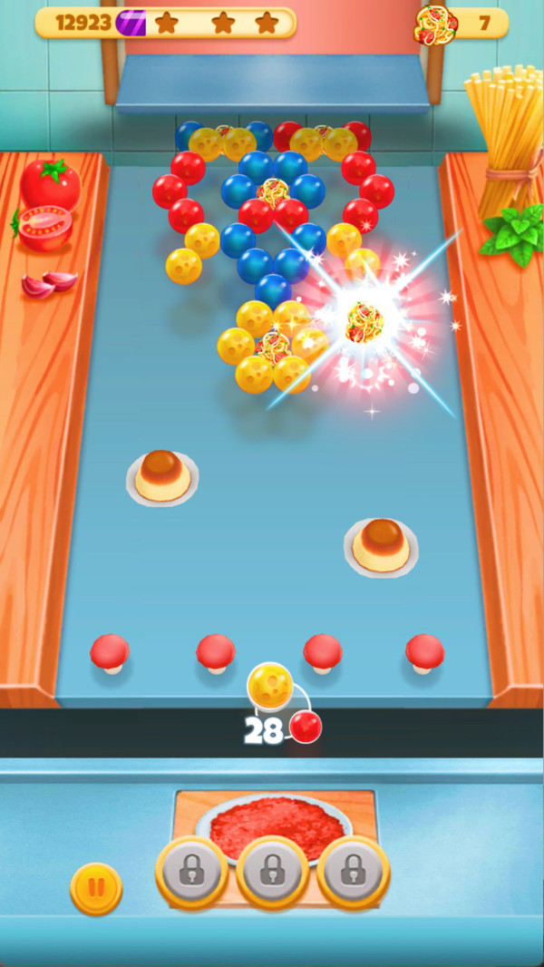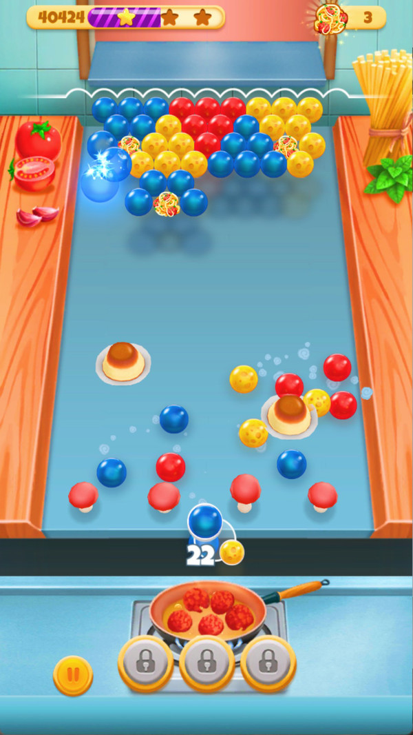 泡泡射手消除是一款射击消除闯关游戏,将泡泡消除与美食收集巧妙结合!调整发射角度,瞄准同色泡泡群,凑齐三个及以上即可消除。连续消除的泡泡越多,得分加成越丰厚,达成目标分数就能通关解锁各类精美美食。丰富关卡搭配可爱画风,还有实用道具助力闯关,掌握消除技巧、收集全球美食就是你的终极目标,快来开启这场趣味十足的泡泡烹饪冒险吧!