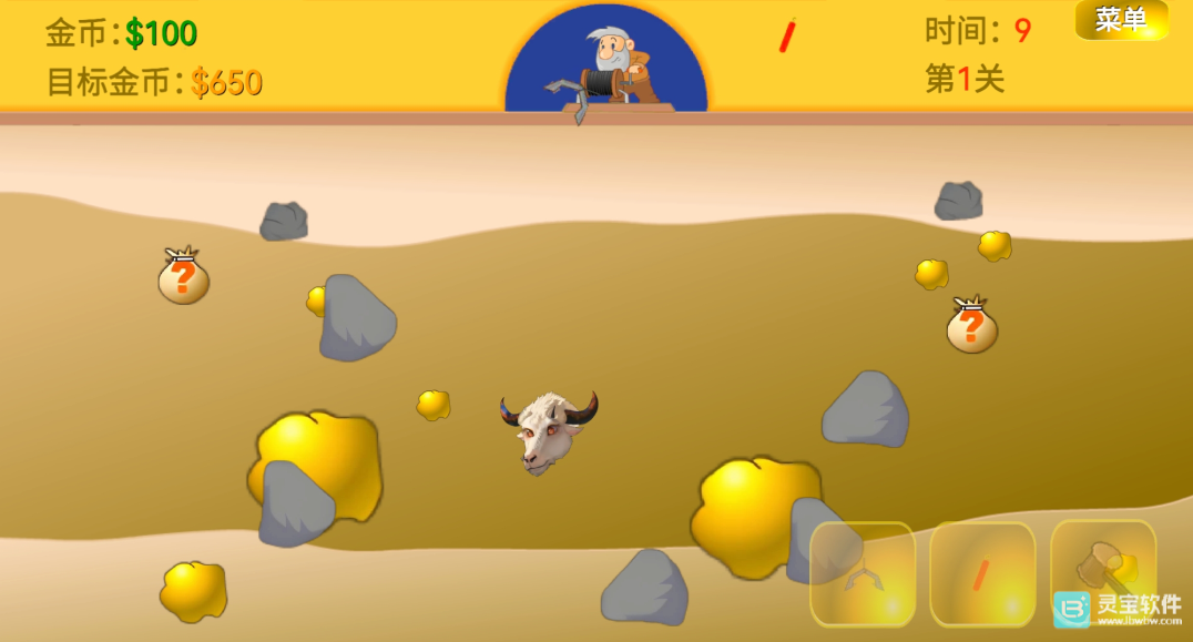 3、之后你就正常抓金矿,点击右下角可以放钩子、丢炸药和扔锤子,扔锤子可以把牛头砸晕,砸晕后可以放钩子抓它,抓到牛头也会有金币。
