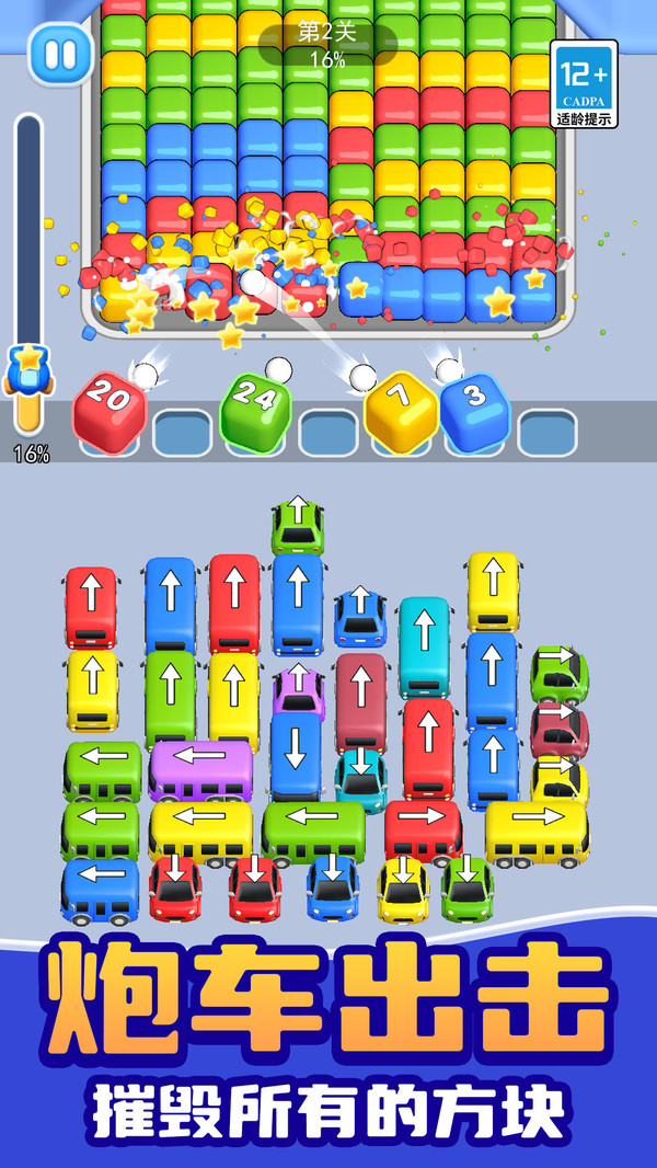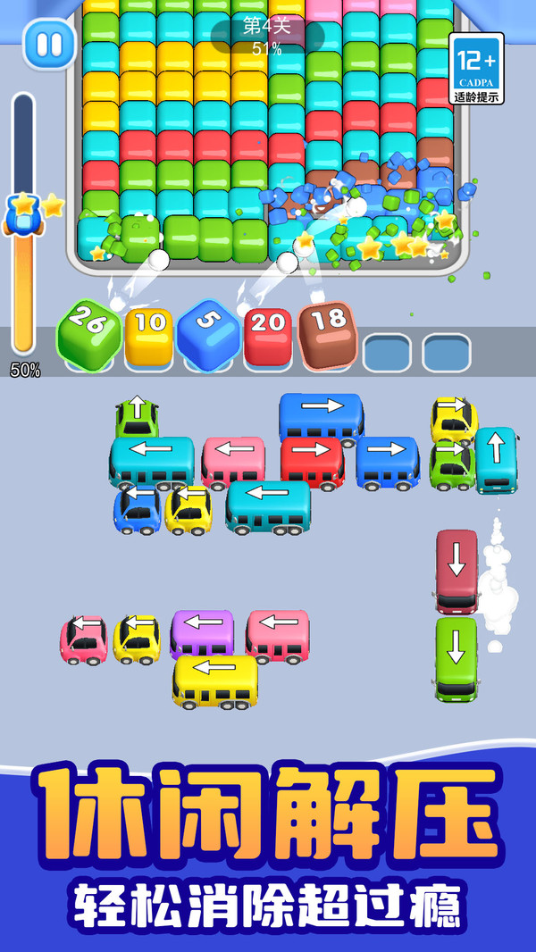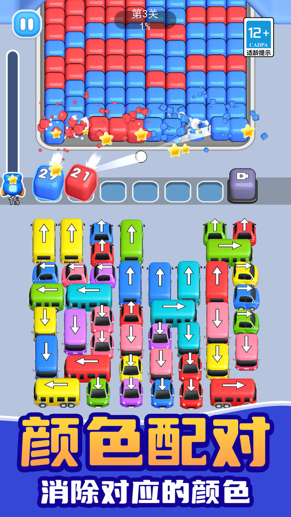 干嘛这样秀是一款清新卡通风的休闲解压游戏!玩家需操控各色小车,按规则消除对应数量的同色方块,同时要规划顺序挪出停车场内的车辆,避开阻挡。干嘛这样秀的关卡任务多样,或限时消方块,或限步数闯关,合理运用道具技能方能通关。既锻炼思维与反应能力,又能收获轻松乐趣,满足不同玩家的挑战需求!