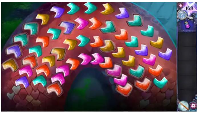 此时点击洞穴爬行者会触发一个小游戏,需要按照下方提示的正确图案摆放所有鳞片:底行依次为红色、粉红色、粉红色、红色,第二行依次为绿色、红色、黄色、黄色、黄色。