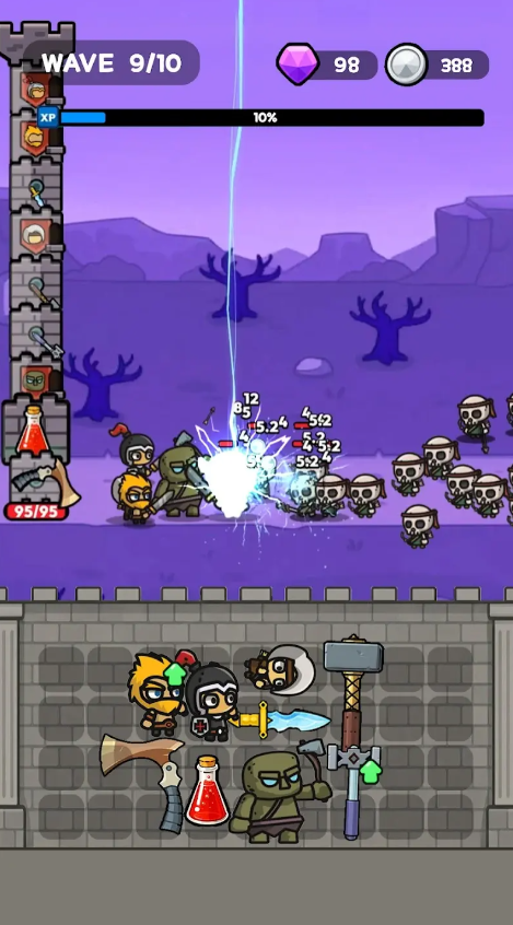1、抵挡来袭的敌人,持续战斗,自动战斗功能将帮助你击败敌人并获得经验值——每次战斗后,你都可以从 3 个随机升级选项中选择一项。