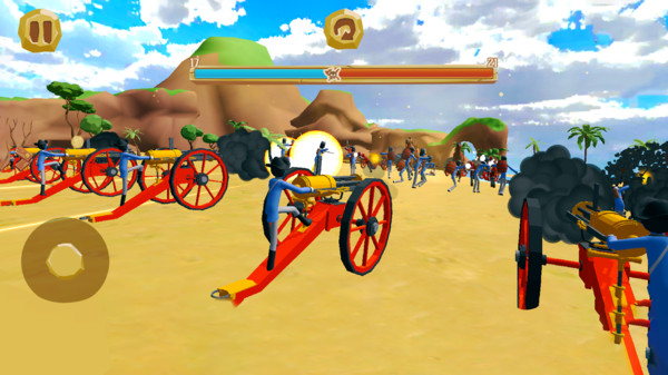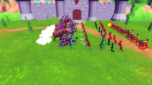 3、玩家不仅可以让两方挥着拳头互殴(话说,他们也没长手,那手长得跟树桩似的),还能给他们配备刀剑、护盾和弓箭,还有大炮,你还可以雇佣战斗鸡帮你赢得胜利。