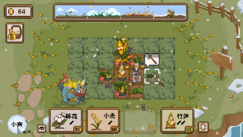 丰收轮回是一款模拟经营游戏。游戏中玩家将经营属于自己的农场,各种各样的农作物都会解锁,玩家可以不断丰富自己的植物,这些植物不仅能为玩家带来一定收入,后续还会有蝗虫之类的害虫出现,玩家要种植组建自己的植物防卫队,将场景内出现敌人全部消灭,保护其他农作物健康的成长。随着玩家不断成长游玩,玩家能够找到最佳的植物组合,以应对来自自然与敌人的双重挑战。