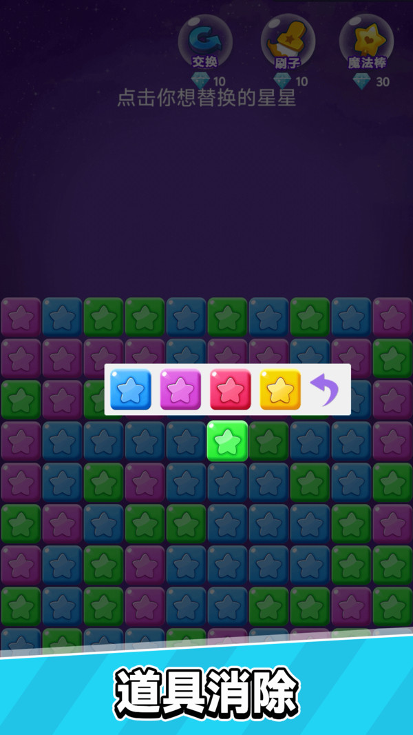 6、滑动模式:向左或向右滑动块以创建和消除整行星星方块。