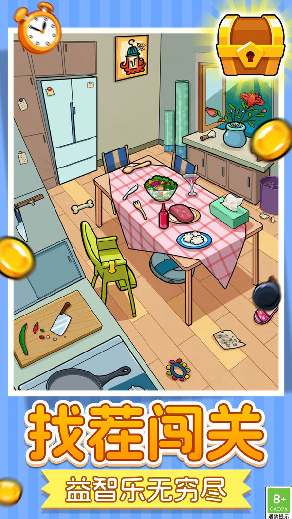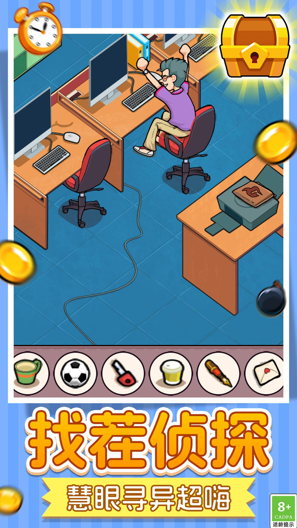 找茬解谜社是一款超具挑战的休闲解谜游戏!置身细节拉满的各式房间场景,寻找藏于摆件、装饰中的指定物品,清空目标即可解锁新关卡。关卡带紧张倒计时,锻炼观察力与反应力,难度循序渐进。游戏配备放大镜、提示卡等实用辅助道具,合理助力闯关又不丢探索乐趣,轻松练就超强眼力,快来解锁找茬达人的解谜快感!