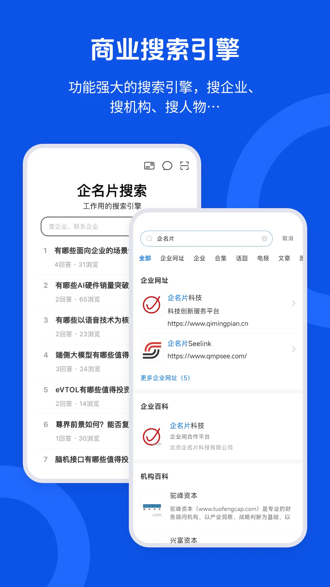 企名片搜索整合动态、百科、工商、价值新闻、融资事件等多维度信息,构建企业立体画像。
