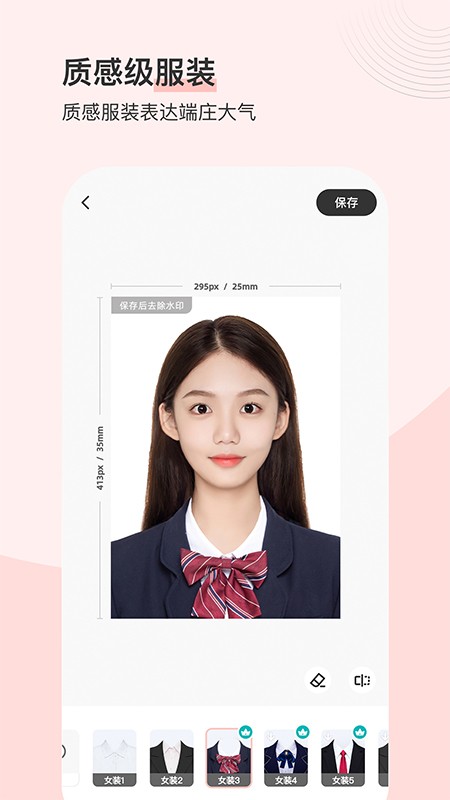 丰富的服装免费更换,大家还可自定义调整服装完美匹配。系统提供多种职业装、正装模板,支持细节微调确保服装与人物完美融合,打造专业得体的证件形象。
