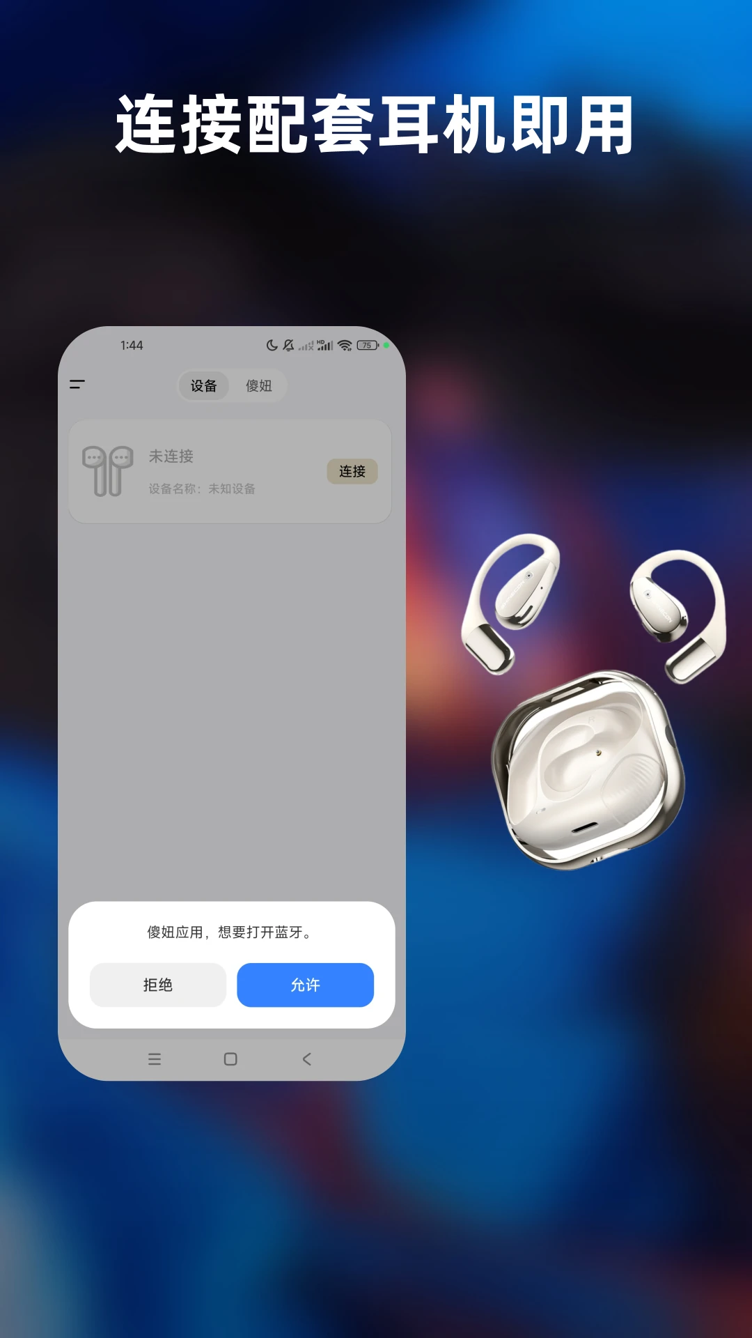 智能设备连接管理:一键跳转系统蓝牙界面快速配对耳机,连接成功后自动返回APP主控界面,支持多设备切换管理。