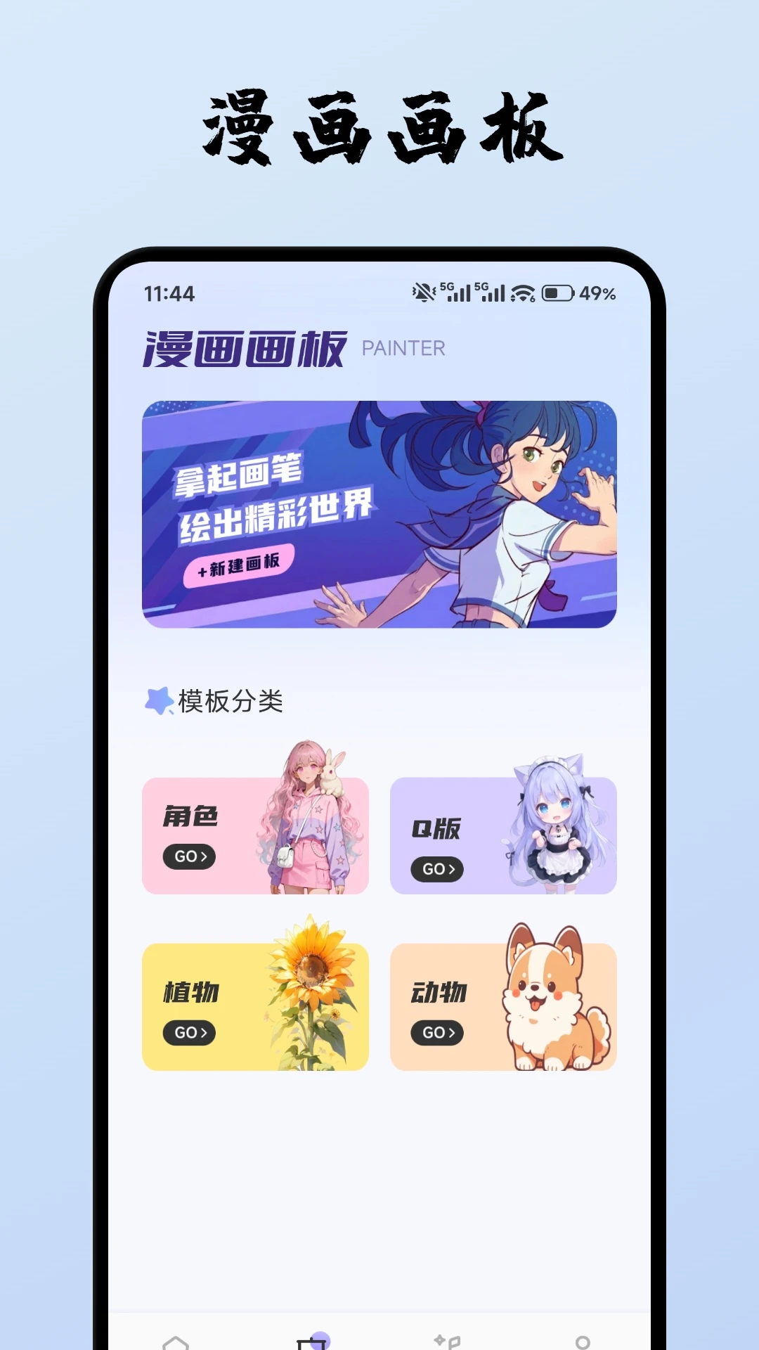 支持新建画板,还提供角色、Q版、植物、动物等模板分类,哪怕是创作新手,也能借助模板快速上手画漫画。