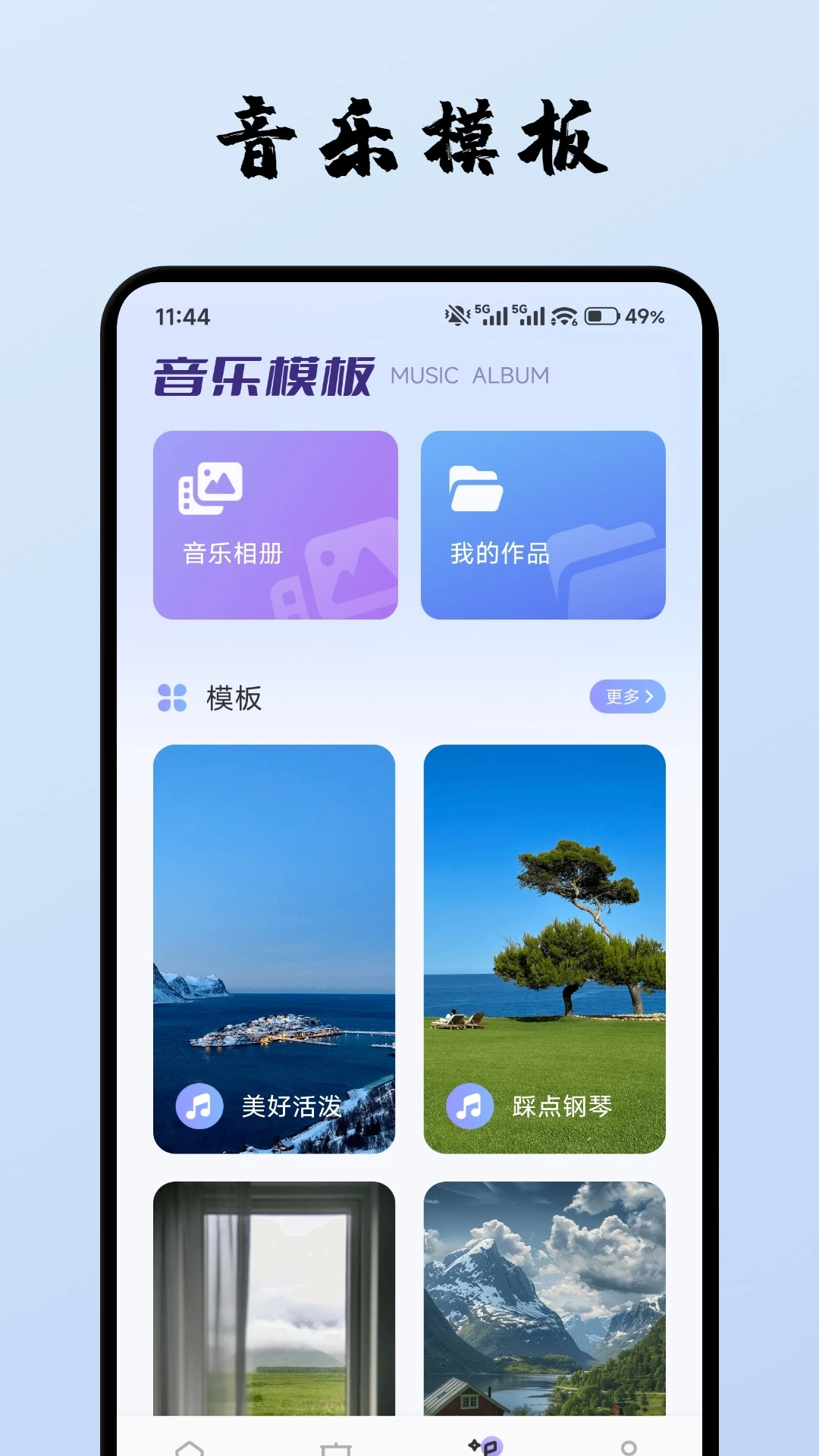 有音乐相册、我的作品管理功能,同时提供“美好活泼”“踩点钢琴”等风格化音乐模板,能快速获取适配的音乐素材。