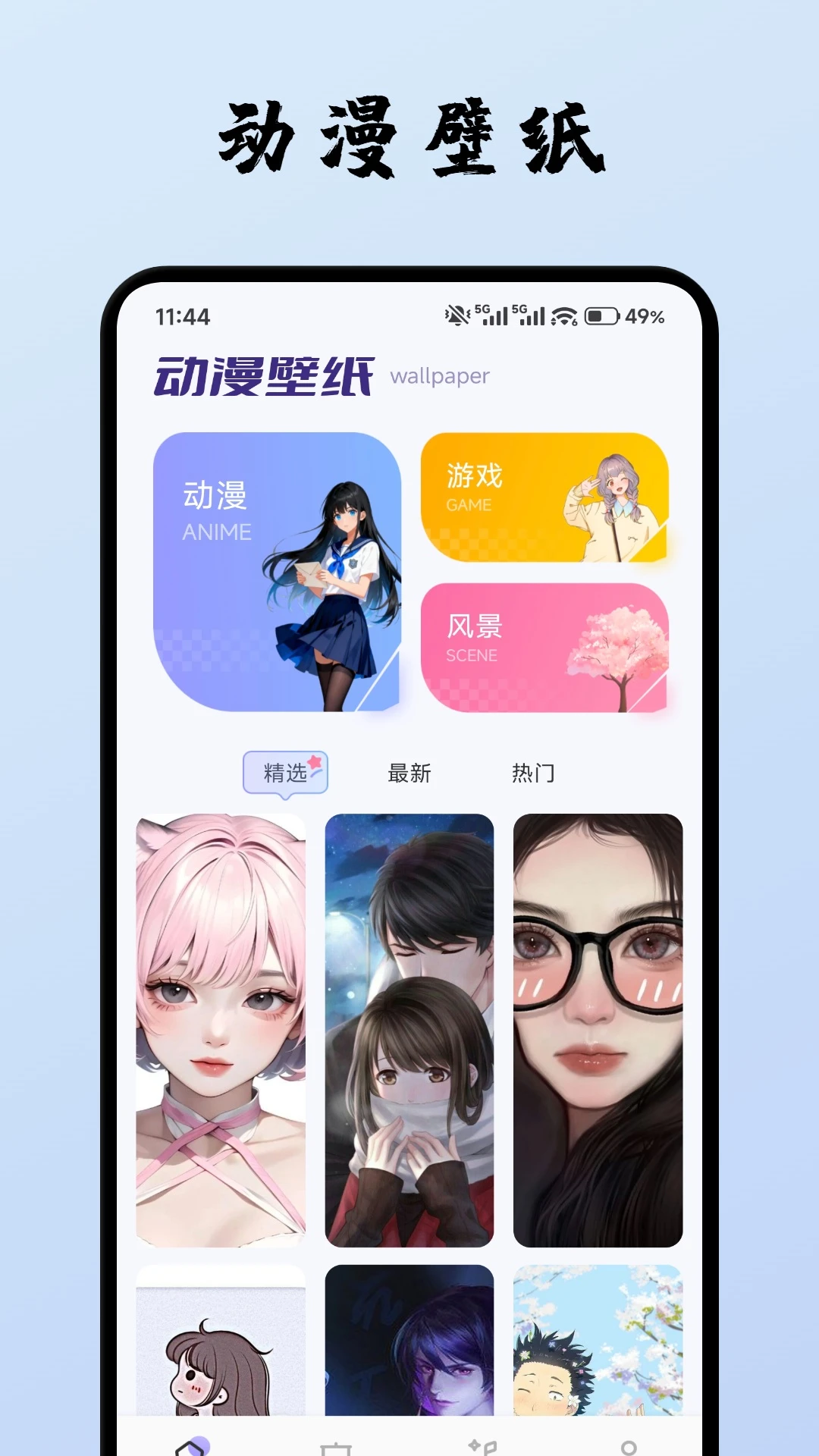分动漫、游戏、风景等类别,搭配“精选/最新/热门”标签,不管是喜欢二次元角色还是动漫风风景,都能快速找到适配的壁纸。