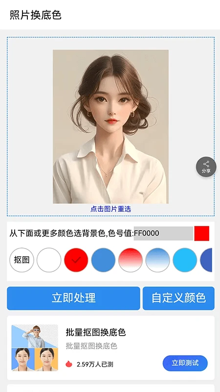 免费证件照换底色:支持一键更换证件照底色,提供多种常用背景色选择。