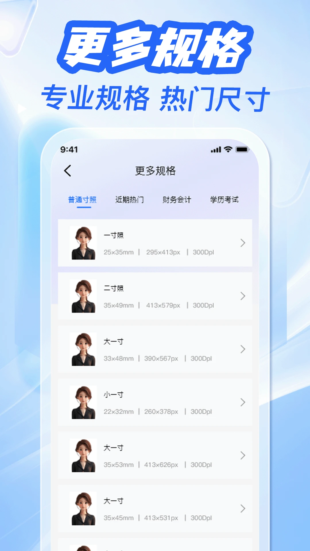 更多规格涵盖:提供专业规格、热门尺寸的证件照选项,包括普通寸照、近期热门、财务会计、学历考试等不同类别下的多种尺寸,如大一寸、小一寸等,适配各类使用场景。