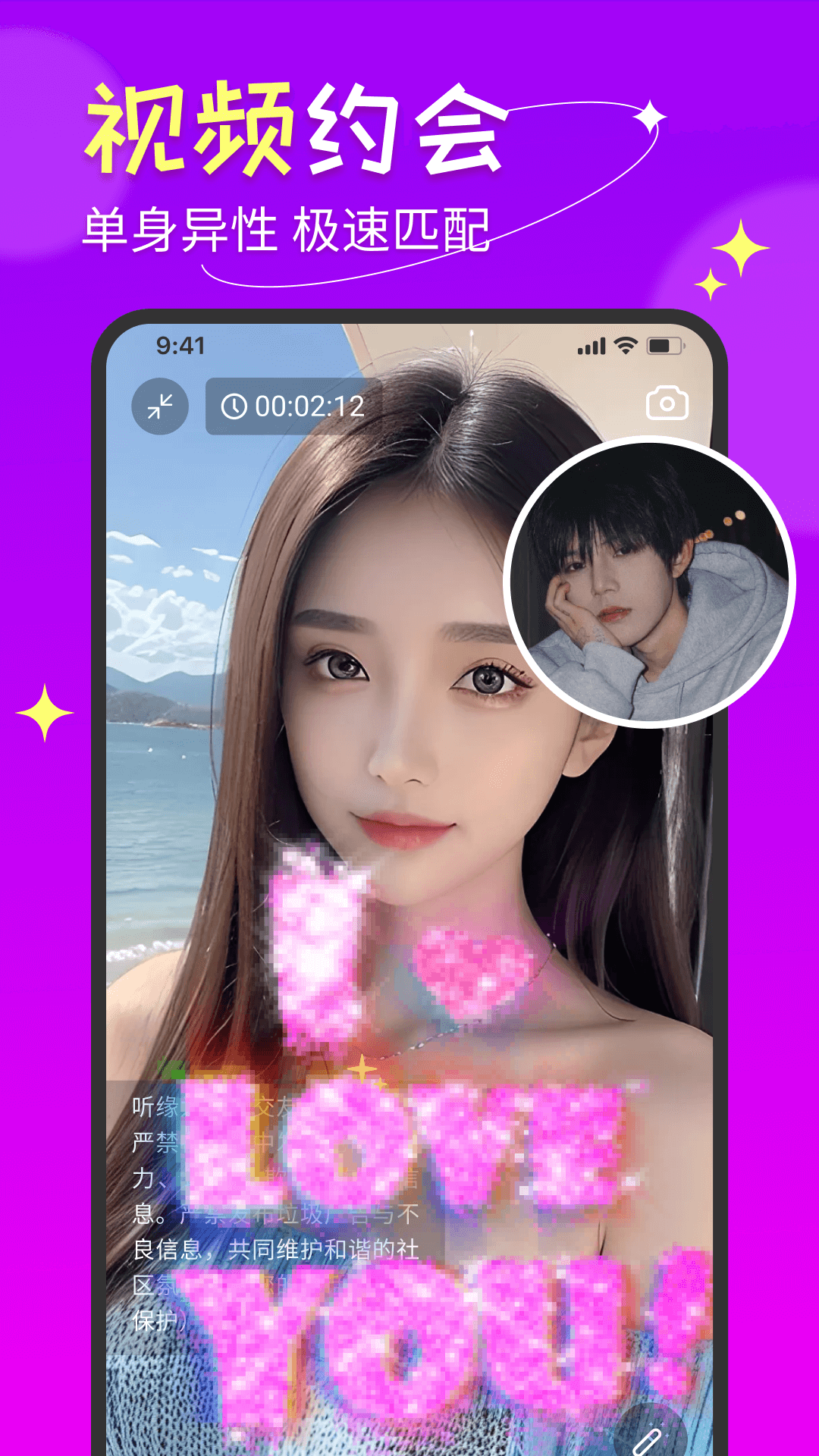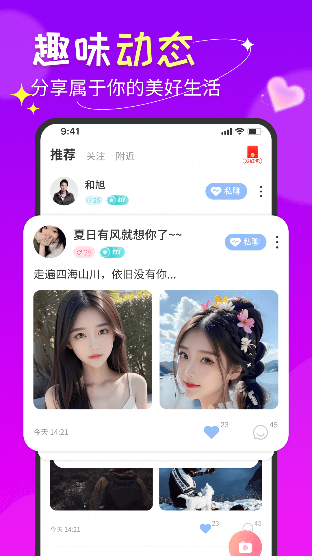 一键连麦,随缘匹配,附近的人,自建房间,边聊边唱,即使单身也有人陪,多种互动方式让交友不再单调;一对一聊天交友,零距离陪伴沟通,能听其声看其貌,甜甜的就是这么,真实互动让感情更自然发展;有颜值、有趣、有才艺的主播,亲密互撩,心动的,相遇本该如此美好,为用户提供高质量的社交体验。