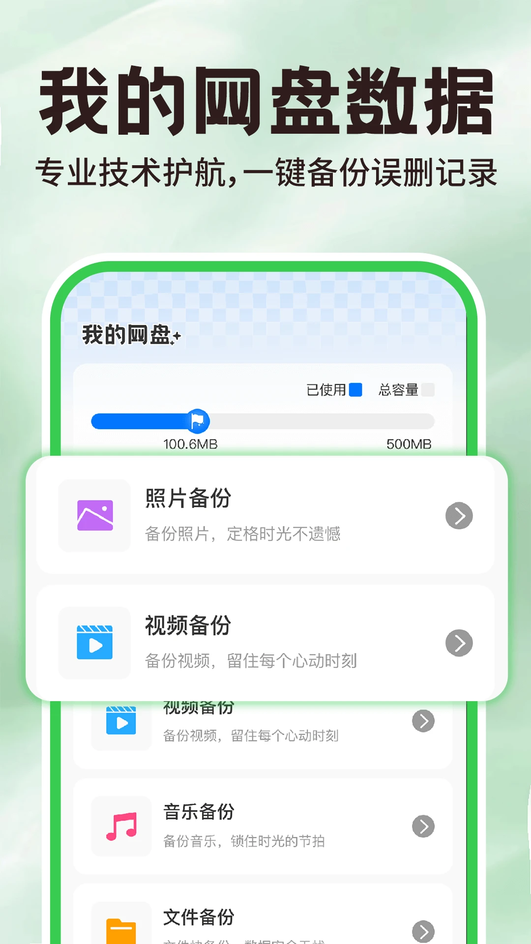 支持一键云备份,涵盖聊天记录、音乐、视频、照片及文档等多种数据类型。