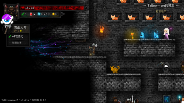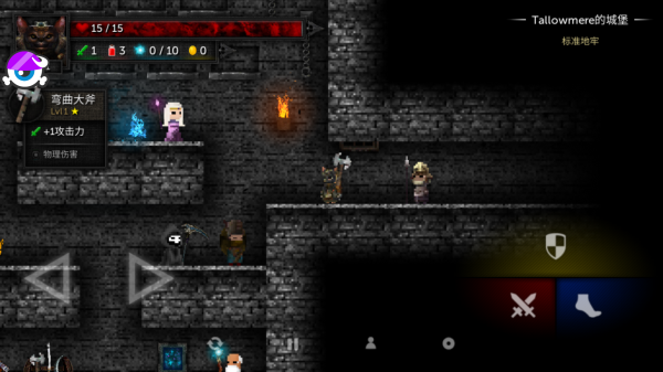 游戏操作简单易上手但富有深度,左侧虚拟摇杆控制角色移动,右侧按钮负责攻击、防御和跳跃等动作,玩家需要熟练掌握这些基础操作才能在战斗中立于不败之地。游戏中的猫咪不仅是剧情的关键元素,更是玩家的重要帮手,长按屏幕即可召唤猫咪标记出最优前进路线,在危急时刻还能消耗小鱼干让猫咪透视出隐藏的机关和通道。此外,玩家需要时刻关注自身状态,战斗后要及时使用药水恢复生命值,也可以向神秘的Tallowmere小姐寻求帮助来获得治疗。