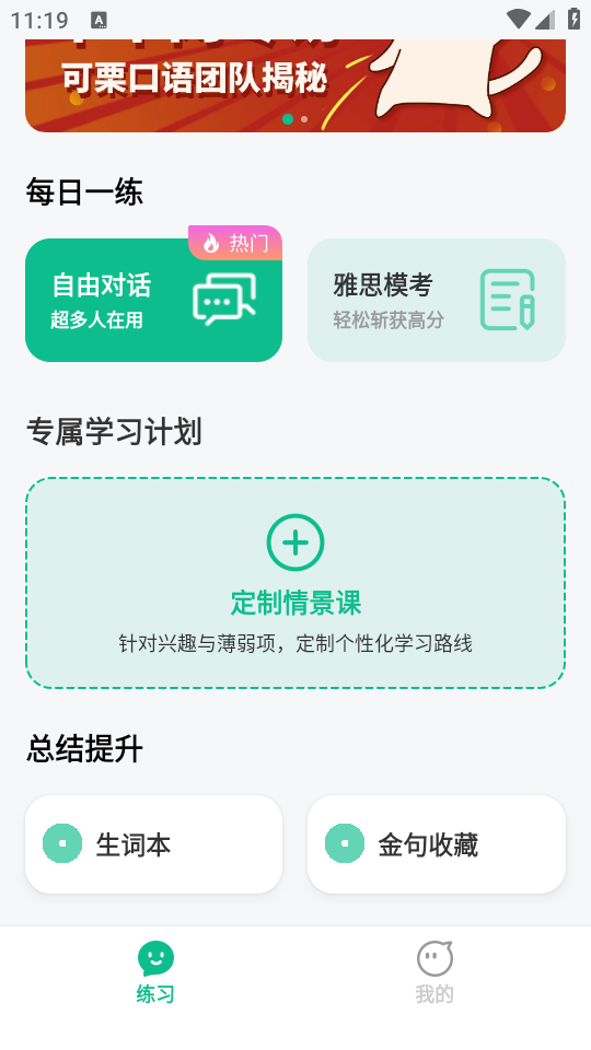 可栗口语app是一款专为英语学习者打造的智能口语训练平台,无论你是零基础小白还是想提升口语水平的进阶用户,都能在这里找到适合自己的学习方案。通过AI智能评测和真人发音示范,帮助用户摆脱"哑巴英语"的困扰,快速掌握地道发音和实用表达。软件采用科学的学习路径设计,从基础发音到场景对话循序渐进,配合趣味互动练习,让英语学习变得轻松有趣。每天只需15分钟,就能显著提升口语流利度,是职场人士、留学生和英语爱好者的理想选择。