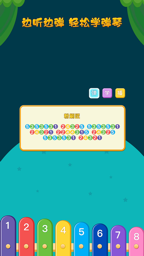 游戏最大的特色是将专业的音乐启蒙教育融入趣味游戏体验中。通过精心设计的渐进式学习系统,从简单的单音弹奏到完整曲目演奏,让孩子在不知不觉中提升音乐能力。三种核心模式相互配合,满足不同学习阶段的需求:"播"模式培养音乐感知,"学"模式掌握基础技巧,"弹"模式锻炼演奏能力。游戏界面采用高对比度的色彩搭配,琴键设计符合儿童认知特点,配合清脆悦耳的音效,打造全方位的感官体验,有效提升孩子的学习兴趣和专注力。