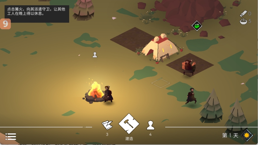 开局需要优先探索三大区域资源分布,中间区域富含铁矿、上方有煤矿、下方盛产黏土,建造桥梁解锁对应建筑是初期关键。建议将篝火放置在树林附近,这样能有效减少夜间防御时的伤亡。合理规划建筑位置可以大幅提升资源收集效率,为后续发展奠定基础。