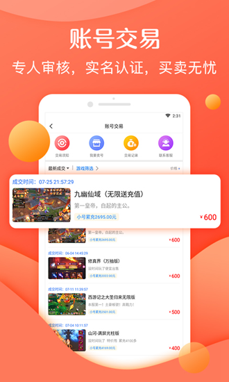 在账号交易方面,平台汇集了当下最热门游戏的各类账号资源,所有交易都经过实名认证和严格审核,确保买卖双方权益。用户可以通过自助发布系统快速完成账号交易,享受无中间商赚差价的实惠价格,交易过程简单高效。