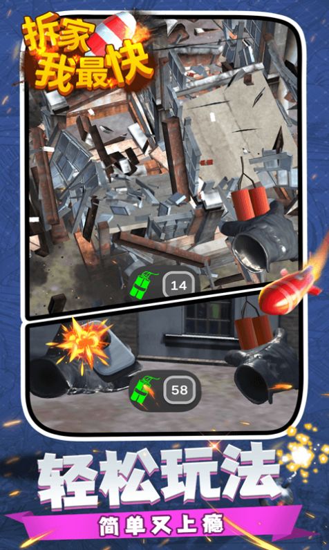 《拆家我最快》是一款充满创意与乐趣的模拟建造与拆除游戏,玩家将扮演一名工头,指挥小人们在城市中完成各种拆家任务。游戏提供了丰富的道具和资源,每一次挑战都带来全新的体验。无论是建造还是拆除,玩家都能感受到独特的操作快感。卡通风格的画面搭配轻松解压的玩法,让玩家在游戏中尽情释放压力。多样的任务和模式等待解锁,每一次拆家都能带来意想不到的惊喜!