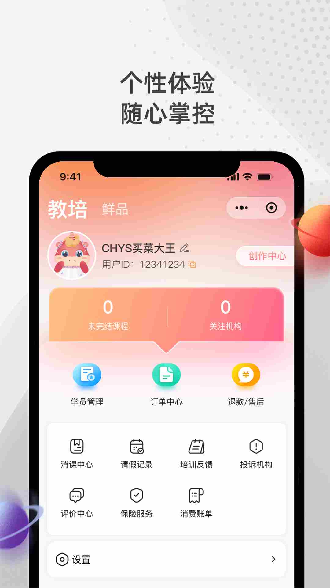 个人中心:个性化设置培训偏好,管理多个孩子的培训信息,支持一键投诉和建议。