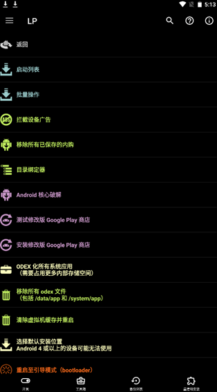显示状态栏通知,随时掌握软件运行状态。支持开机自动破解,省去手动操作的麻烦。可显示系统应用,方便进行深度管理。提供BusyBox安装/更新功能,增强系统兼容性。允许更改应用调用的权限和活动,实现高度自定义。内置SuperSU安装功能,可修复root权限受损问题。自动清理/data/app/中的无用ODEX文件,优化系统性能。支持自动更新功能,确保始终使用最新版本。界面方向可自由切换,适应不同使用习惯。可将SD卡数据目录绑定到其他目录,灵活管理存储空间。支持将应用移动到/system/app/目录,实现系统级管理。无需ROOT权限即可重建SD卡上的APK文件,使用门槛更低。