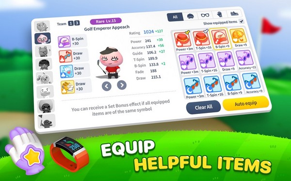 游戏以全球著名高尔夫球场为舞台,玩家将穿梭于不同国家的特色场景中进行比赛。赞助商系统增加了游戏深度,完成特定挑战可以解锁稀有奖励和特殊赛事。冒险模式提供了完整的剧情体验,玩家可以在此磨练技术并获得珍贵道具。极限模式打破了传统高尔夫玩法,采用即时对抗机制,让比赛更加紧张刺激。角色培养系统允许玩家自由搭配技能和装备,打造专属的竞技风格。KakaoFriends角色收集系统增添了收集乐趣,每个角色都有独特的技能树和成长路线。