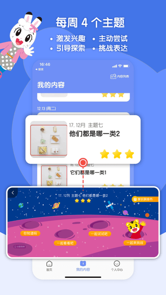 每周主题:每周四个主题,挑战表达和快乐体验。主题内容涵盖生活常识、科学知识、艺术启蒙等多个领域,全面拓展孩子的视野。