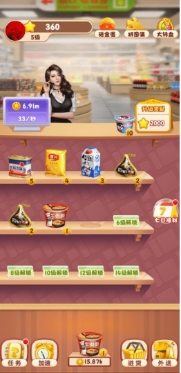 《天天逛超市》的UI设计简洁而富有细节,游戏场景丰富多样,包括超市、仓库和游戏内的其他店铺,每个场景都经过精心设计,营造出逼真的经营环境。游戏的2D画面风格温馨可爱,色彩明亮,给人一种轻松愉悦的感觉。