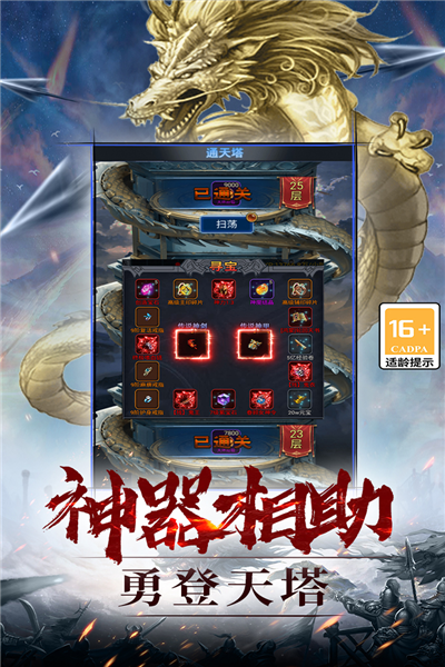 神兵系统:收集并强化各种传奇武器,获得攻速加成和特殊效果,轻松击败高级BOSS,享受满屏光柱掉落的快感。