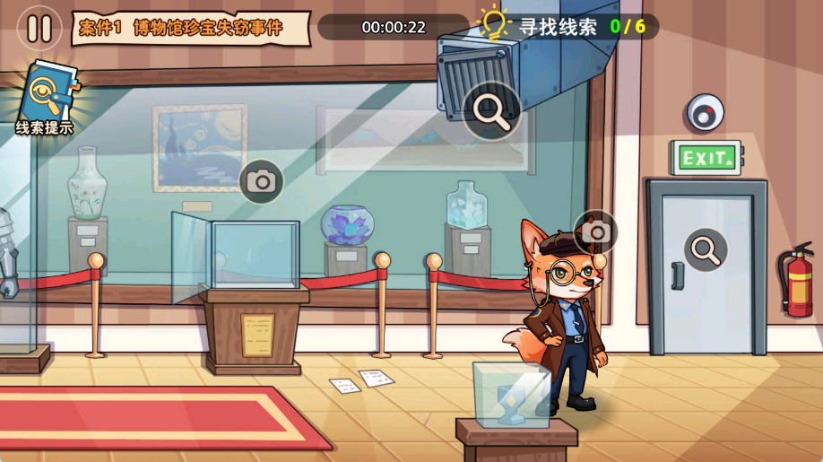 在博物馆珍宝失窃案件中,玩家需要仔细观察每一个细节。首先点击狐狸侦探头顶,会发现一处重要线索。召唤出助手后,他会协助拍照取证。使用放大镜仔细检查监控区域,可以发现关键线索。调查门的位置也会发现新的线索。将椅子从左推到右可以打开通风管道的入口,最终珍宝就藏在这里。游戏中所有线索都环环相扣,需要玩家耐心收集和整理。