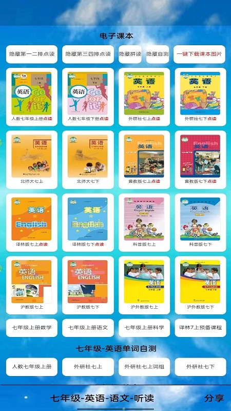满足不同用户的学习需求,带来了更多的优质服务。随时随地在线学习辅导,是大家学习必备的神器。初中英语七年级的所有课文并有同步翻译,支持单句循环播放和跟读评分功能。七年级英语点读软件,在线英语点读服务,提供单词释义查询和例句展示功能。为您带来全方位的学习点读项目,让您的课程学习更加方便,可以随时查看学习进度。解题步骤规范详细,让学生养成规范答题的好习惯。所有课文的单词、词组的在线自测,支持自定义生词本功能。与课堂教材同步,知识点全囊括,逐字逐句精讲精析,配套单元测试和期中期末模拟试题。