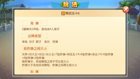 疯狂五十K是一款融合了争上游、找朋友、斗地主等多种玩法的创新扑克游戏,起源于湖北黄石地区,在当地拥有广泛的群众基础。这款游戏最大的魅力在于其独特的玩法设计:炸弹系统极具爆发力(三张或以上相同牌型即可组成炸弹),出牌方式灵活多变(三张或以上牌可组成顺子),战术策略丰富多样(融入找朋友机制,需要玩家在出牌时判断敌友关系)。为了进一步提升游戏体验,我们特别增加了炸弹翻番机制,让每一局游戏都充满惊喜和变数,玩家在这里不仅能享受扑克竞技的乐趣,更能体验到"一局定乾坤"的刺激快感。