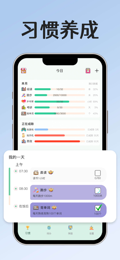 功能全面覆盖习惯养成需求:从日常打卡到待办管理,从番茄钟专注到线上自习室;既能找到学习伙伴,又能进行1v1监督;既助力好习惯培养,也支持坏习惯戒除。一站式解决自律难题。